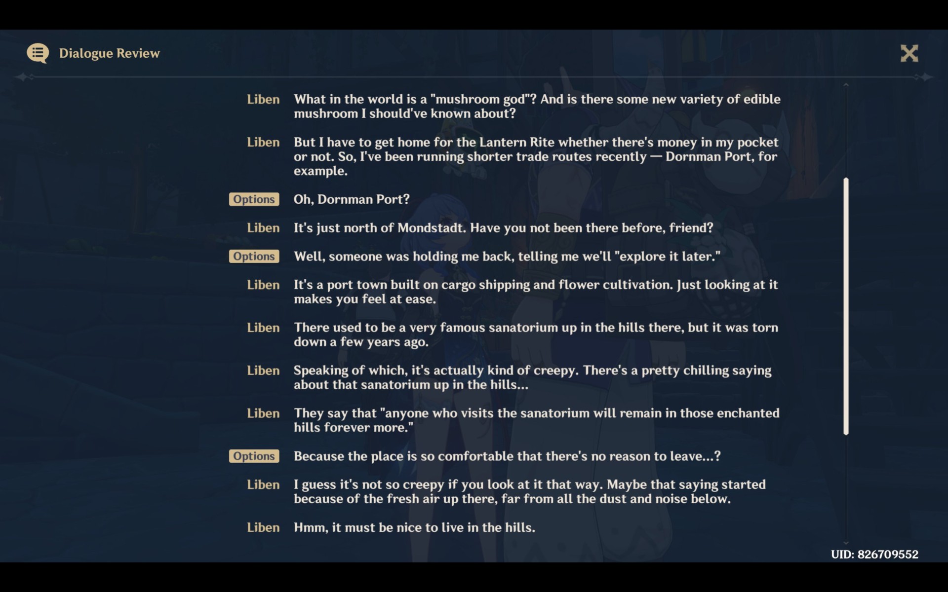 One of the most intriguing parts of the dialogue comes when Liben mentions that there used to be a very famous sanatorium in the hills near Dornman Port, which was torn down years ago. He adds that the location is associated with a chilling saying. According to local rumors, anyone who visits the sanatorium will remain in those enchanted hills forever. While Liben downplays the creepiness by suggesting the phrase may simply refer to the area’s clean air and tranquility, the wording strongly implies unresolved lore.
