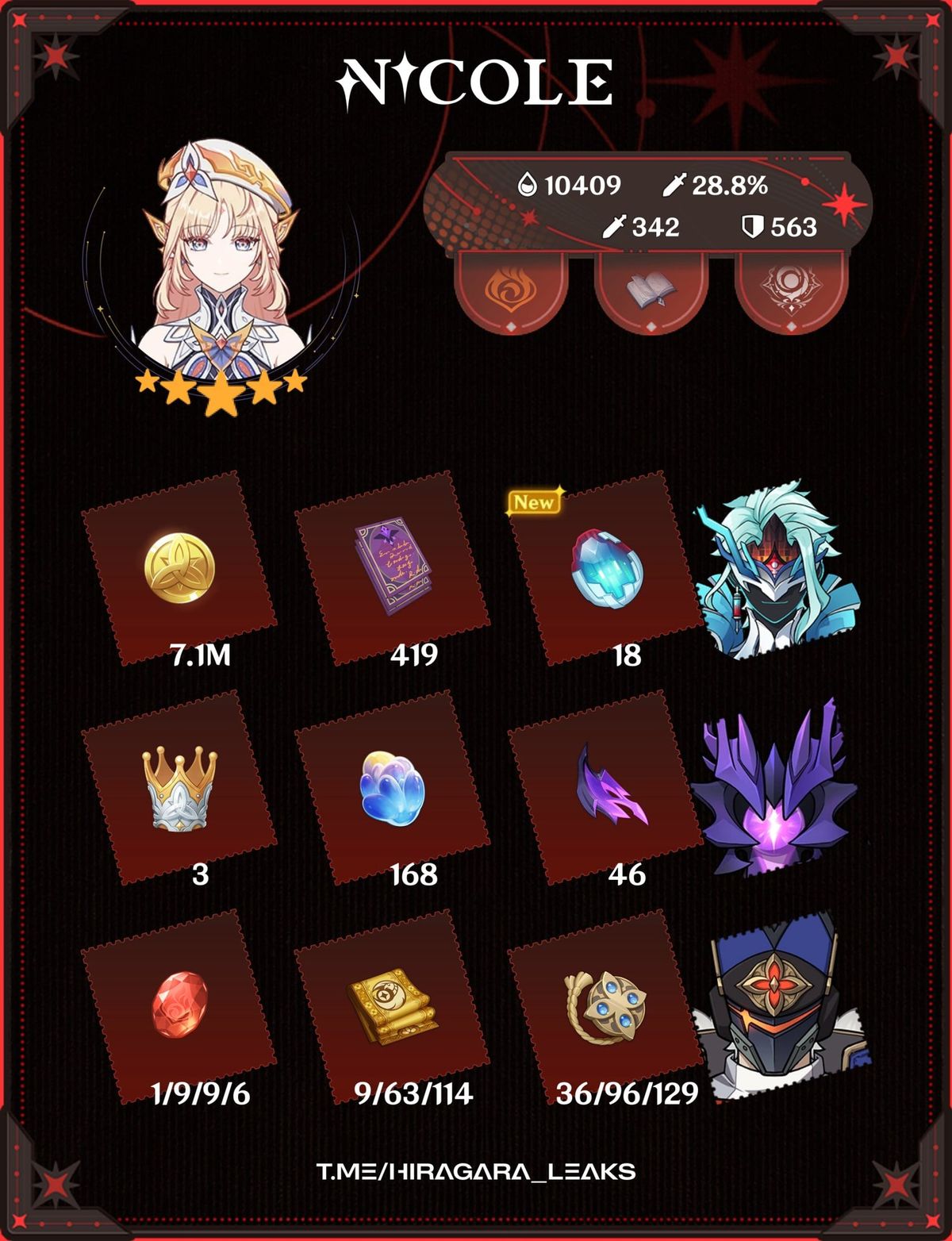 Subtitle: Comprehensive datamined images provide a complete list of items needed to maximize Nicole, the upcoming Pyro Catalyst character expected to debut in the 6.6 update.