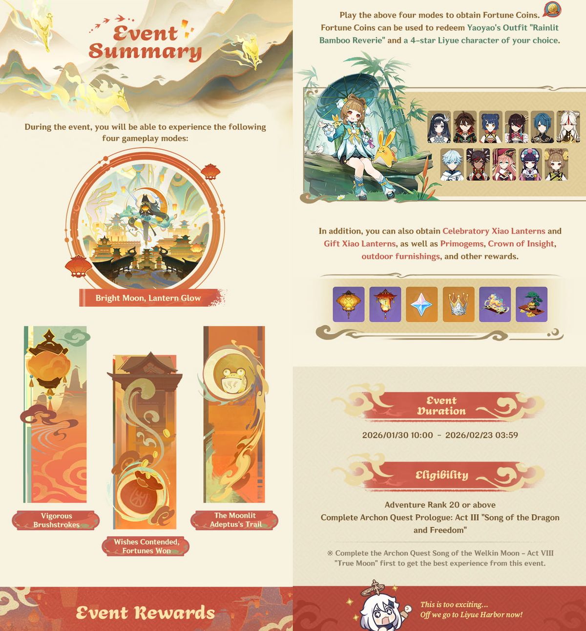 According to the official announcement, the A Lanternlit Ode to the Silver Moon event and its accompanying storyline will begin on 2026/01/30 at 10:00. As always, Lantern Rite represents a moment of reunion, remembrance, and hope, where Liyue dons its festive colors to honor the past while looking toward the future. The atmosphere is defined by warm lights, cultural rituals, and a strong sense of community that has become iconic within the Genshin Impact experience.