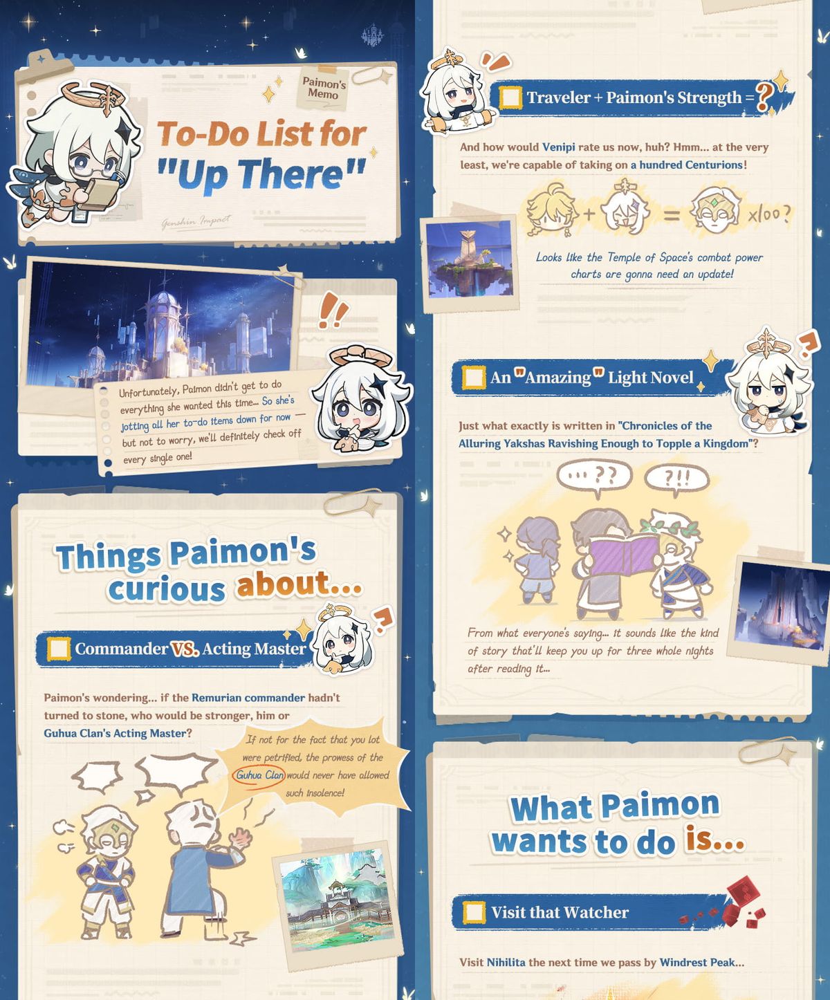 Ultimately, “Paimon’s Memo: To-Do List for ‘Up There’” is more than just a convenience feature. It represents a thoughtful evolution in how Genshin Impact delivers content, blending exploration, narrative, and player guidance into a cohesive system. As the Temple of Space continues to expand in future updates, this memo may become an essential tool for players seeking to uncover every secret hidden “up there.”