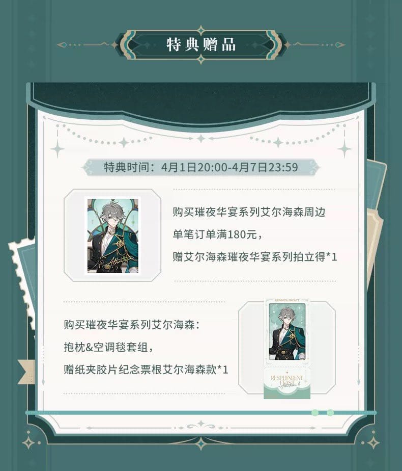 One of the standout offerings in this release is the Resplendent Feast Series dakimakura, which will be available for pre order starting April 1 at a price of 99 CNY. This item is expected to be a major draw for collectors, combining premium material design with the refined aesthetic of the Resplendent Feast theme.
