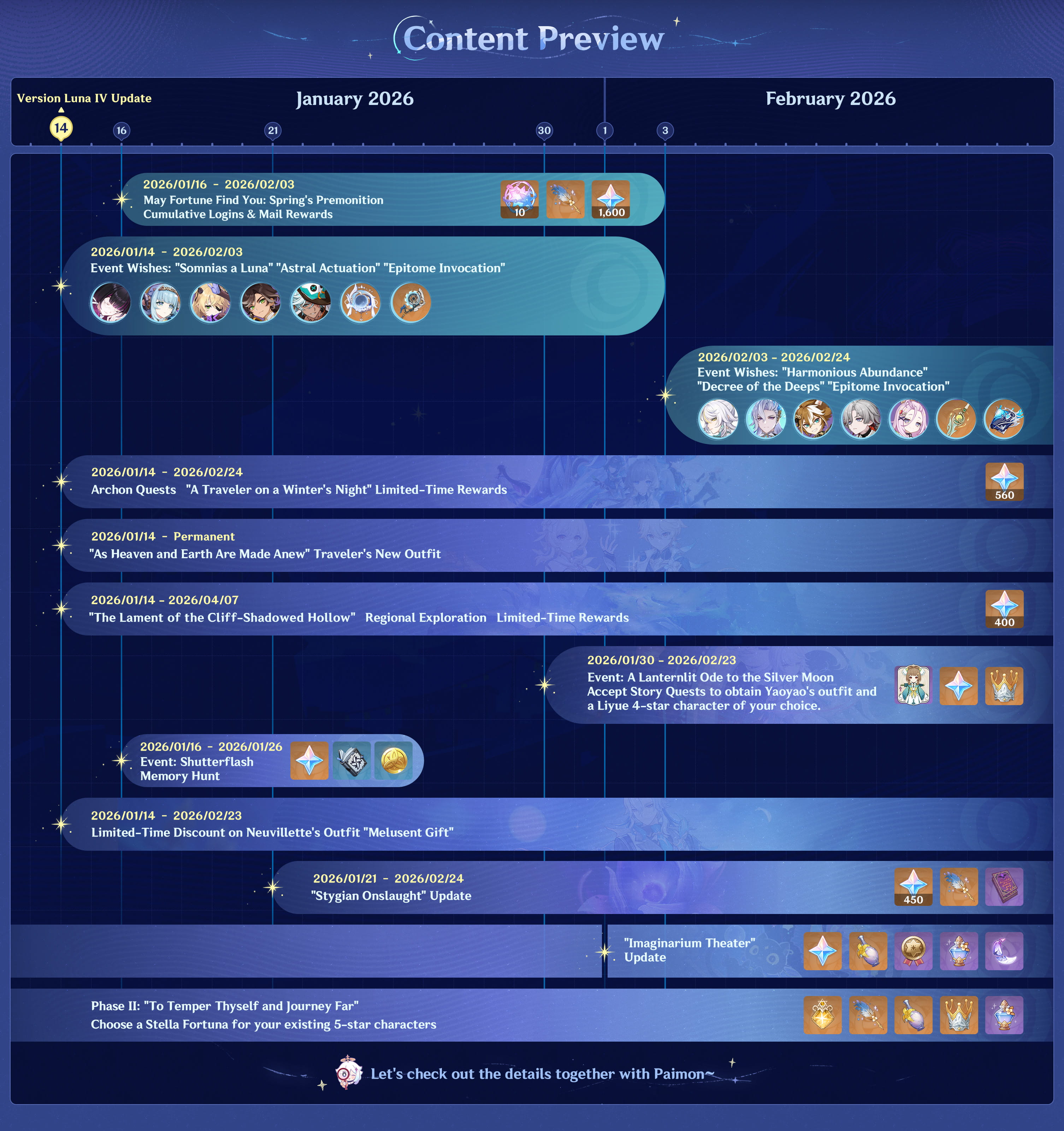 As Version “Luna IV” of Genshin Impact approaches, HoYoverse has published the “A Traveler on a Winter’s Night” Events Preview - Phase I to highlight some of the biggest content players can look forward to once the update goes live. This first phase focuses on community rewards, seasonal events, interactive activities, and plenty of festive content designed to welcome the version’s launch and keep Travelers engaged throughout the early weeks after release. Version Luna IV is scheduled to go live on January 14, 2026, bringing new story beats, characters, and seasonal festivities into Teyvat.