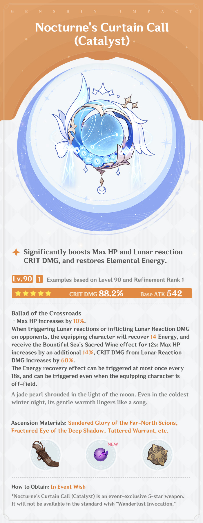 Overall, Nocturne’s Curtain Call stands out as one of the most reaction-focused catalysts ever released in Genshin Impact. With its strong emphasis on Max HP, Lunar reaction CRIT DMG, and off-field Energy recovery, it is poised to become a cornerstone weapon for the Luna IV era. Travelers planning to fully embrace the new Lunar mechanics should keep a close eye on this catalyst once Version “Luna IV” goes live.
