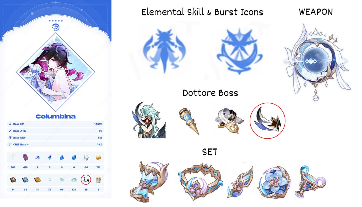 El parche introduce un nuevo jefe semanal vinculado a Dottore. Este jefe suelta materiales avanzados necesarios para ascender a Columbina y su arma distintiva. Esto posiciona a Dottore como central en el ciclo de mejora para los personajes de la versión 6.3.