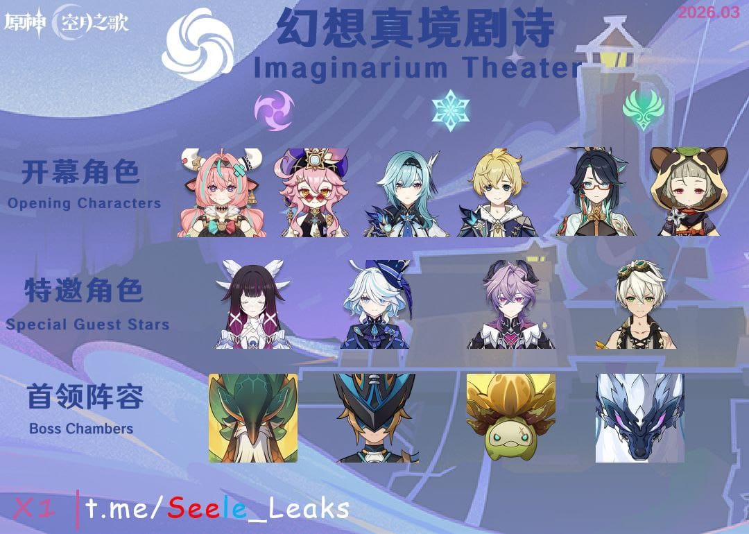La imagen filtrada también confirma las Mejoras Elementales activas durante esta rotación del Teatro Imaginarium. Los elementos potenciados son Electro, Cryo y Anemo. Se espera que los personajes que utilizan estos elementos obtengan un rendimiento mejorado a través de las mejoras específicas del Teatro, animando a los jugadores a priorizar reacciones, aplicación elemental y estrategias de control de masas impulsadas por Anemo.