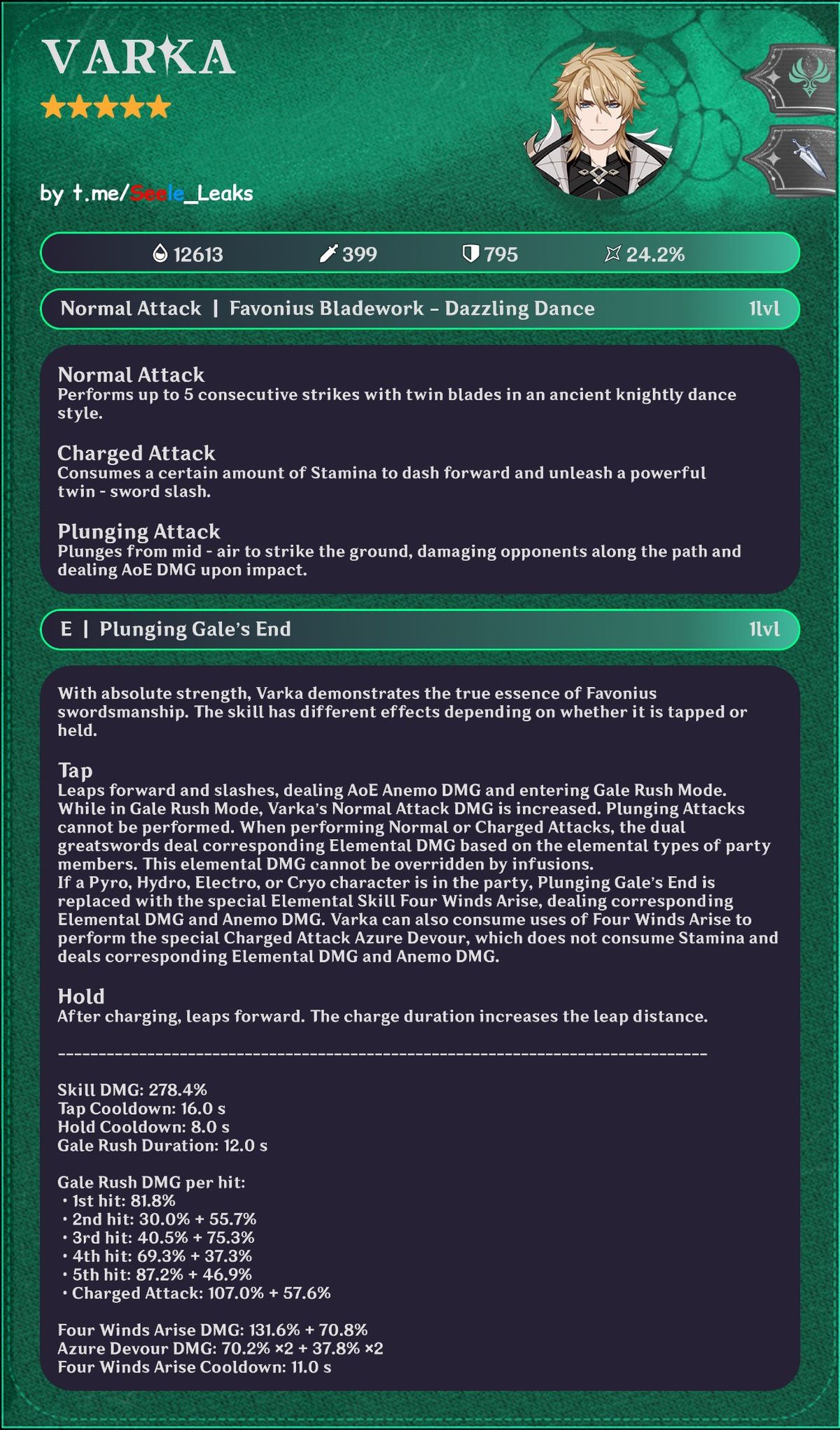 Toda la información anterior se basa en filtraciones de la beta de la Versión 6.4 e imágenes extraídas de datos y está sujeta a cambios antes del lanzamiento oficial. Si es precisa, Varka se posiciona como uno de los personajes DPS Anemo más complejos mecánicamente y dependientes de sinergias introducidos hasta ahora.