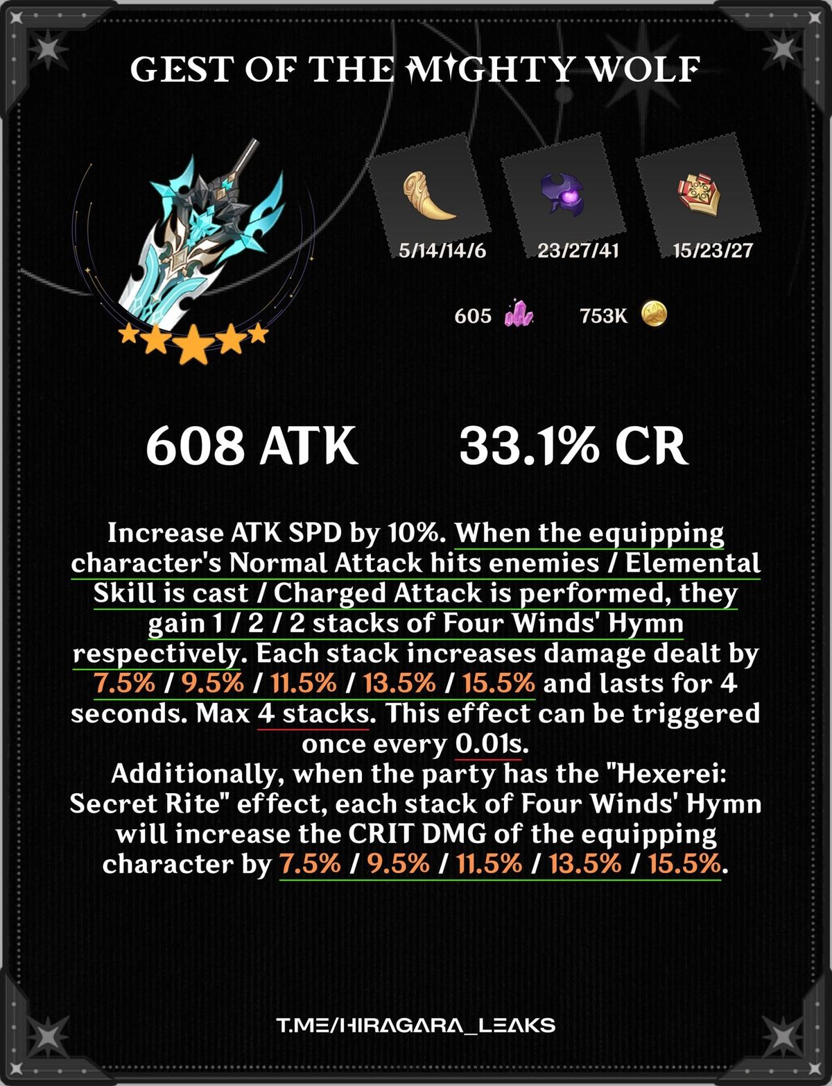 El Arma Distintiva de Varka también ha sido objeto de discusión en las filtraciones, y los datos 6.4v3 parecen refinar sus efectos. Los valores previamente filtrados mostraban que el efecto de aumento de daño del arma se establecía en 6% durante cuatro segundos con hasta cinco acumulaciones, y que cada acumulación podía activarse una vez cada 0.1 segundos. Según las filtraciones actualizadas, la mejora ha sido reequilibrada, ahora aumentando el daño infligido en un 7.5% durante cuatro segundos, con el número máximo de acumulaciones reducido a cuatro, y el intervalo de activación ajustado drásticamente a 0.01 segundos. Estos cambios se interpretan como un cambio hacia una acumulación más receptiva y un mantenimiento pasivo más fluido, mejorando la rapidez con la que el efecto puede aplicarse en escenarios de combate frenéticos. Los comentarios de la comunidad también señalan que el arma ahora aumenta explícitamente el Daño CRIT del personaje que la equipa en un 7.5%, lo que se alinea con el enfoque de crítico mejorado de Varka.