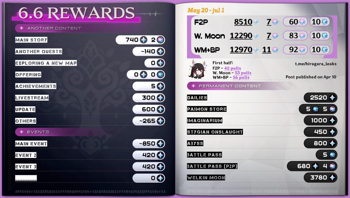 Según la filtración, los jugadores F2P pueden esperar alrededor de 60 deseos, lo que se traduce de aproximadamente 8510 Protogemas junto con otras monedas limitadas adicionales. Este total incluye las recompensas de los encargos diarios, eventos, reinicios del Abismo y compensaciones por actualización, formando la base para los jugadores que no gastan dinero.