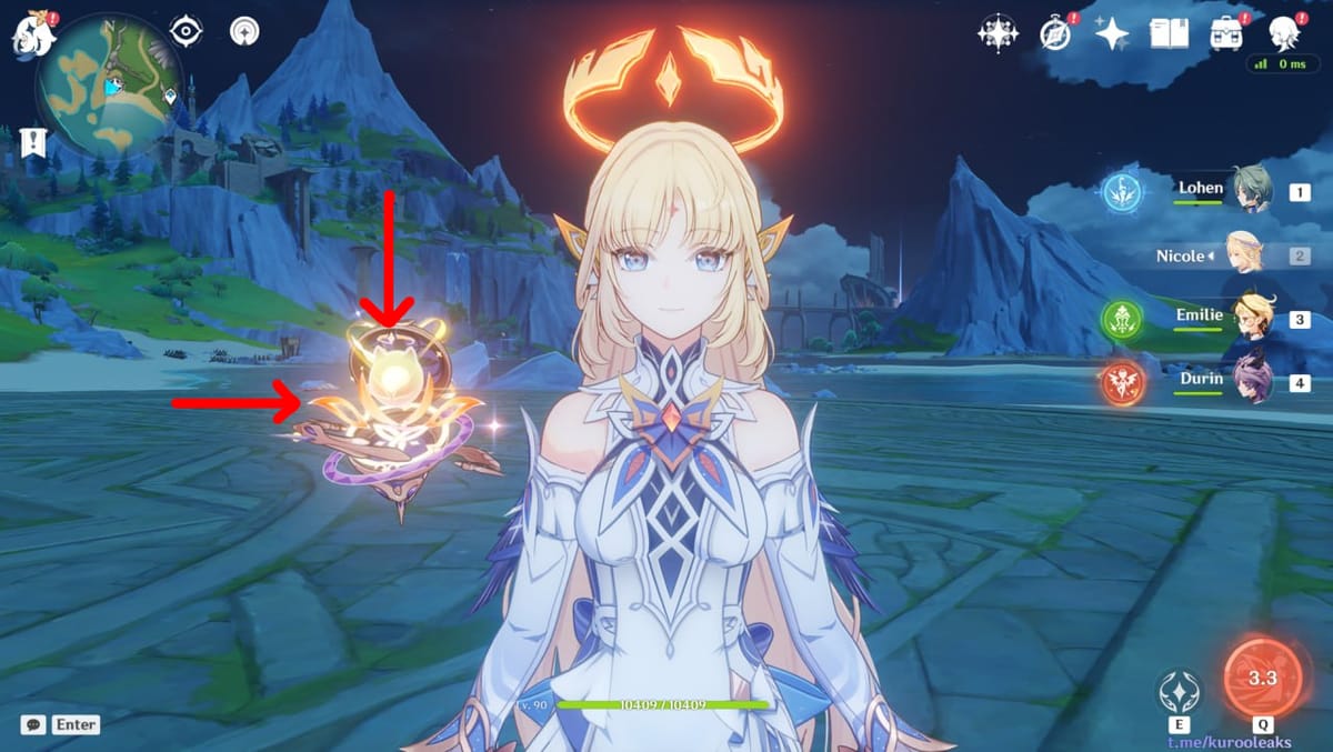 Otro punto destacado importante es su ataque cargado, que presenta a un compañero Seelie visible. Según la imagen filtrada, el Seelie se manifiesta durante el ataque, actuando posiblemente como un indicador visual o incluso como una extensión funcional de sus habilidades. Esta característica ha llevado a especular que el kit de Nicole podría girar en torno a entidades invocadas o construcciones de apoyo, añadiendo profundidad a su estilo de combate.