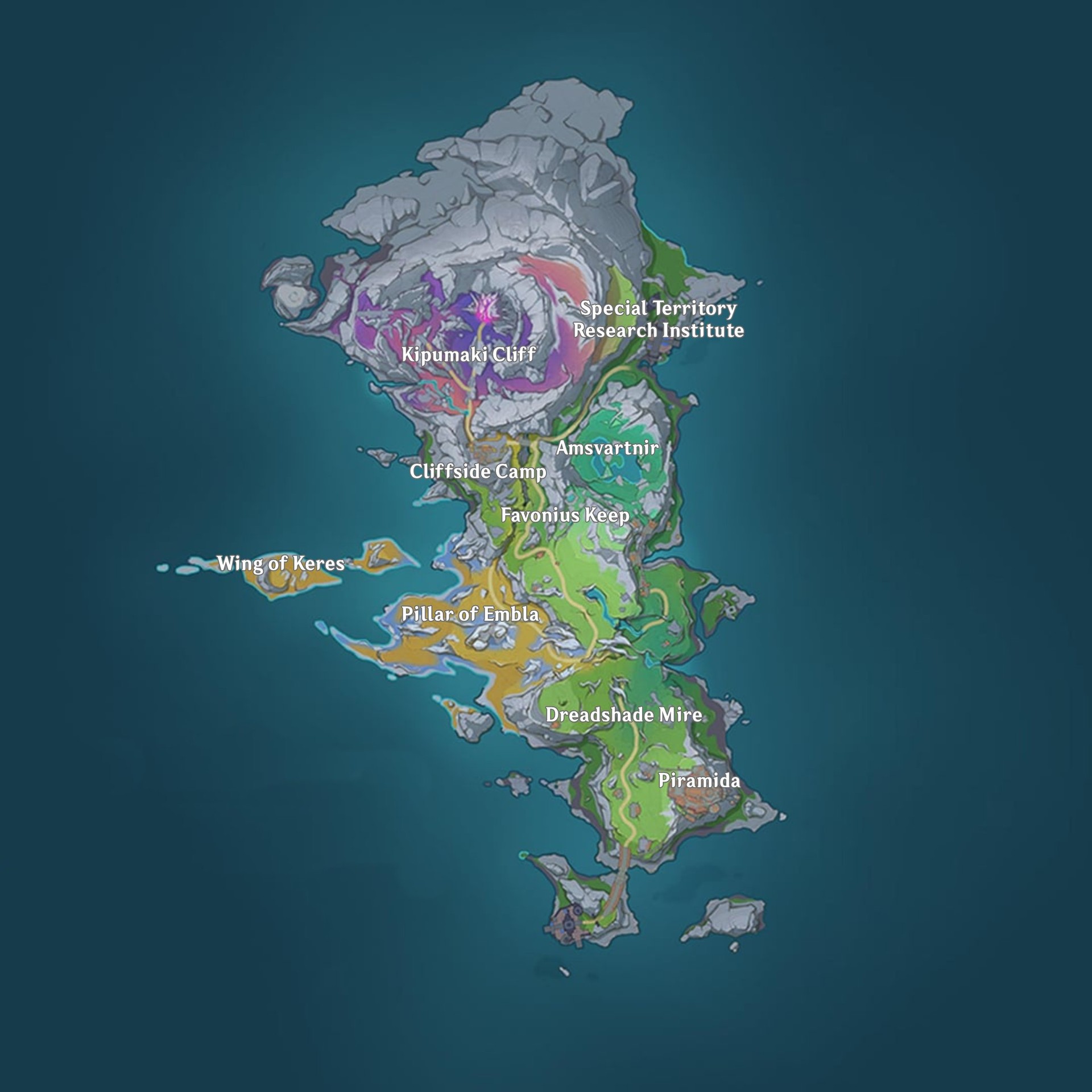 Además, ha aparecido una nueva imagen del mapa de la versión 6.3 con nombres de lugares en inglés, ofreciendo una visión más clara de la geografía de la próxima zona de Nodkrai. Las ubicaciones etiquetadas visibles en el mapa incluyen: