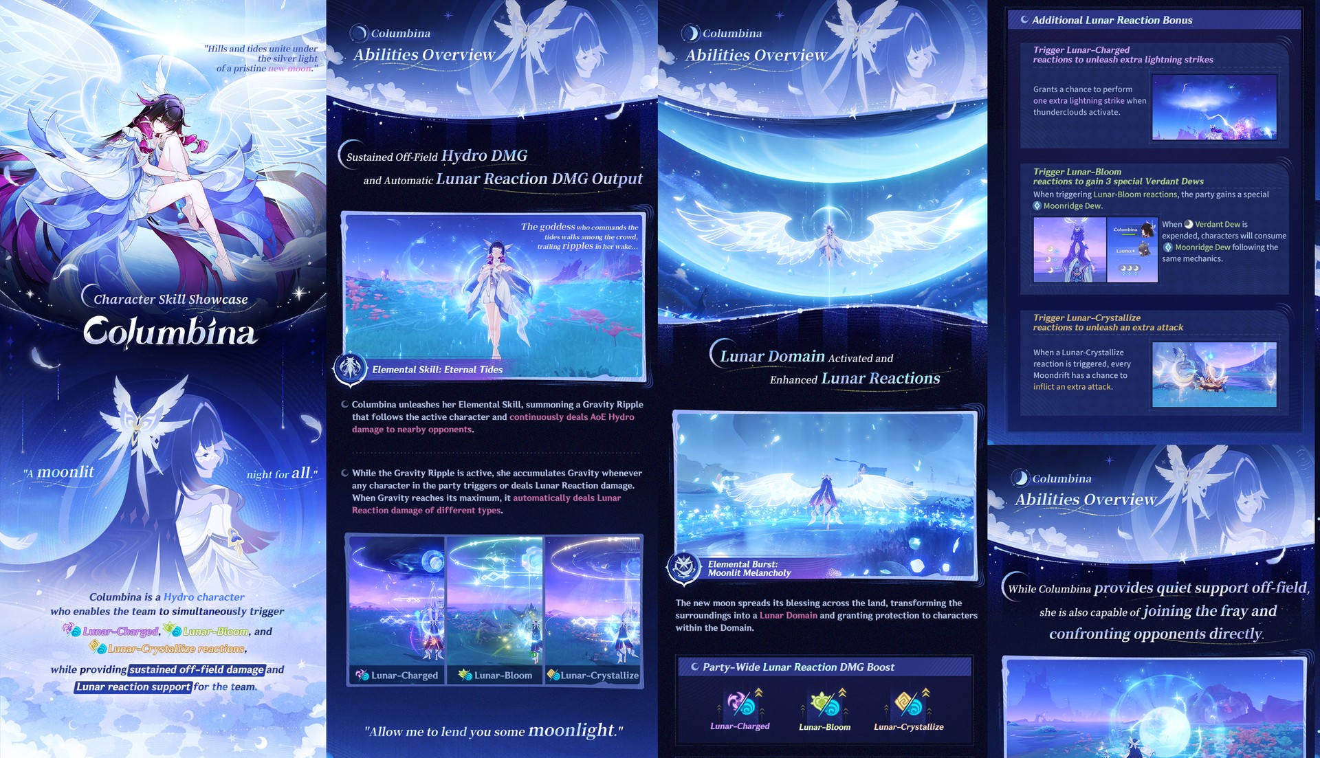 La presentación proporciona información sobre cómo funciona Columbina en batalla y las ventajas estratégicas que aporta a las composiciones de equipo. Como personaje Hydro con una fuerte utilidad de apoyo, las habilidades de Columbina refuerzan tanto el potencial de las reacciones elementales como la sinergia del equipo, especialmente cuando se combina con otros elementos vinculados al sistema de Reacciones Lunares introducido en Luna IV.