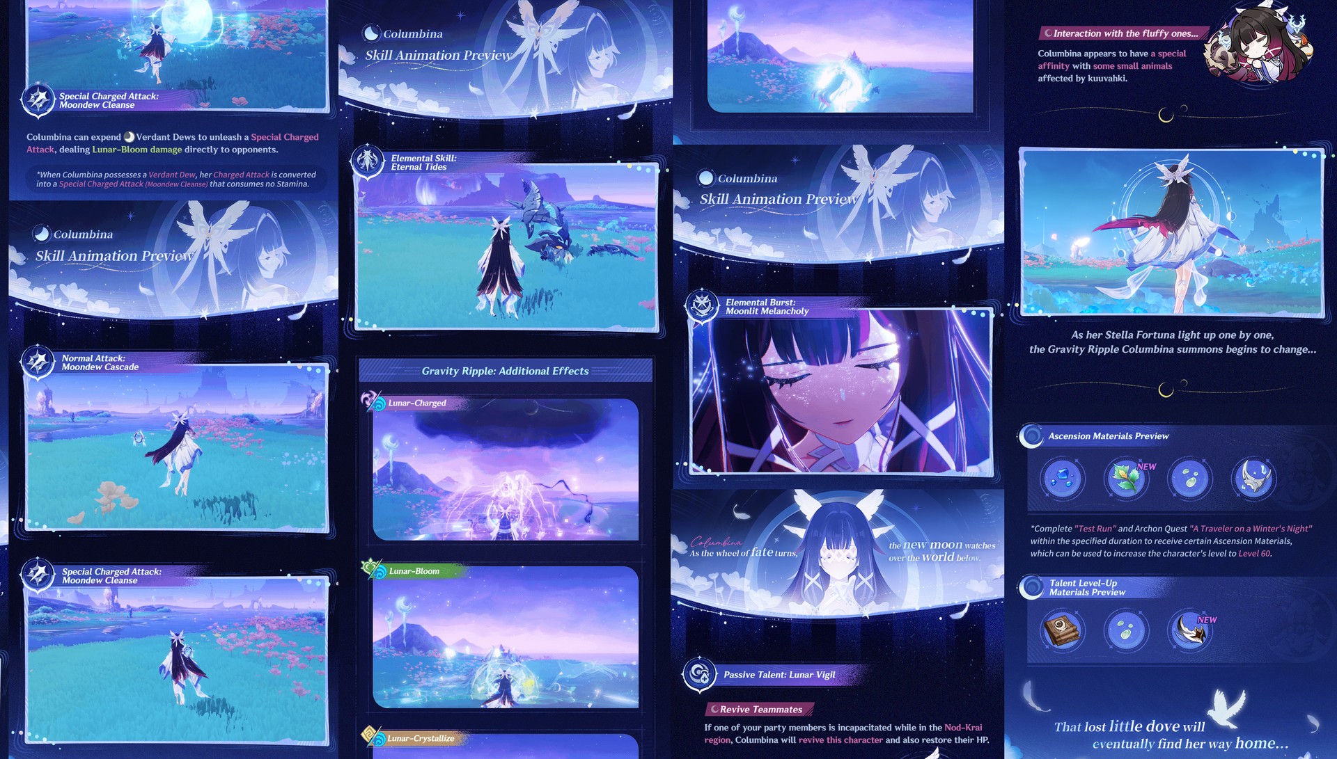 La presentación oficial también destaca las animaciones de combate de Columbina, que combinan fluidos efectos Hydro con una estética celestial que refleja su temática lunar. Sus secuencias de animación enfatizan la elegancia y el control, reforzando su papel como un apoyo estratégico con catalizador Hydro en lugar de una tradicional DPS de daño explosivo.