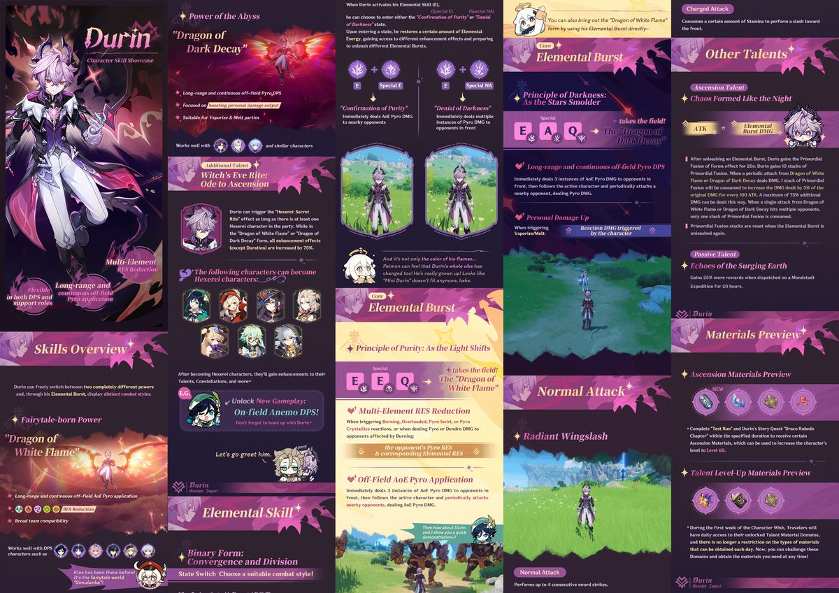 HoYoverse ha lanzado la Presentación Oficial de Habilidades del Personaje Durin, ofreciendo a los Viajeros una visión clara de cómo el dragón Pyro de Simulanka luchará en Genshin Impact. La descripción general confirma a Durin como una unidad híbrida flexible, capaz de funcionar tanto en roles de soporte puro fuera del campo como de DPS Pyro de alto impacto. El póster destaca tres características principales: reducción de RES multielemental, aplicación Pyro de largo alcance y continua fuera del campo, y una gran flexibilidad en la construcción de equipos.