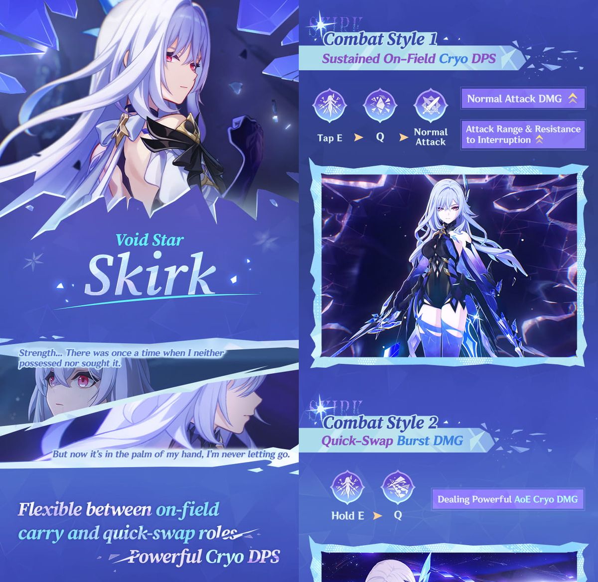 El avance describe a Skirk como una luchadora formidable cuya fuerza se compara con el viaje personal que ha emprendido desde su llegada a Teyvat. A través de encuentros con nuevos aliados y la exposición a culturas desconocidas, ha desarrollado gradualmente una comprensión más profunda tanto del mundo que la rodea como de los sentimientos en su propio corazón.