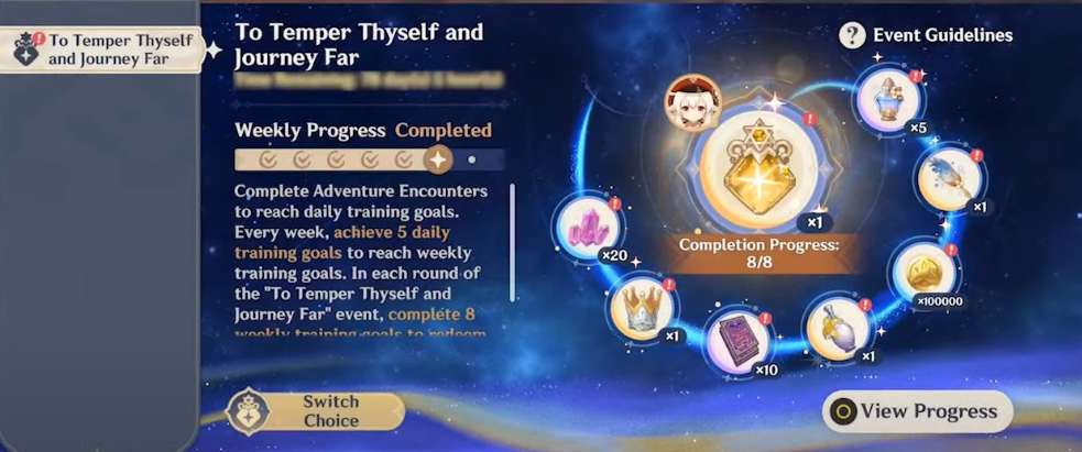 El título del evento refleja un tema central de crecimiento personal y perseverancia. “Para Templarse” sugiere el refinamiento a través del desafío, mientras que “Viajar Lejos” evoca el espíritu narrativo más amplio de exploración que define a Genshin Impact. Juntas, estas frases enmarcan el evento como algo más que un bono de inicio de sesión estándar. Representa un camino estructurado de compromiso y avance constante.