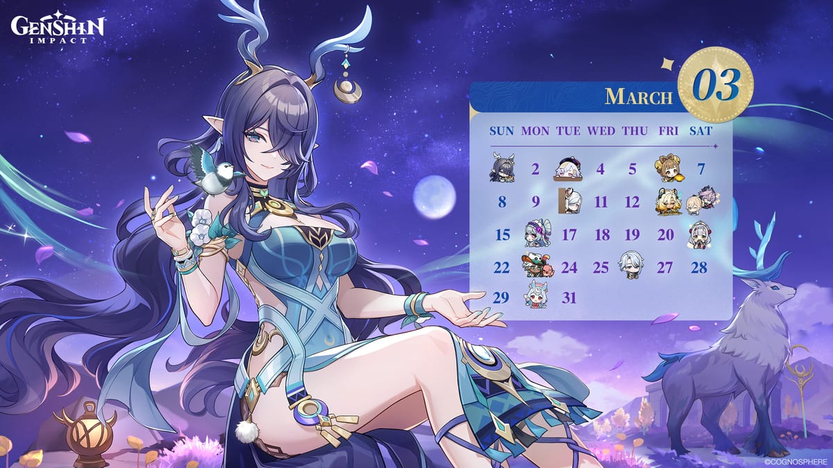 Los fondos de pantalla del calendario de marzo están disponibles para que los fans los descarguen y usen libremente, continuando la tradición de Genshin Impact de lanzar imágenes temáticas mensuales con personajes queridos. Estos fondos de pantalla no solo sirven como elegantes fondos digitales, sino que también celebran los cumpleaños de los personajes del juego en marzo, animando a la comunidad a compartir sus buenos deseos en las plataformas sociales.