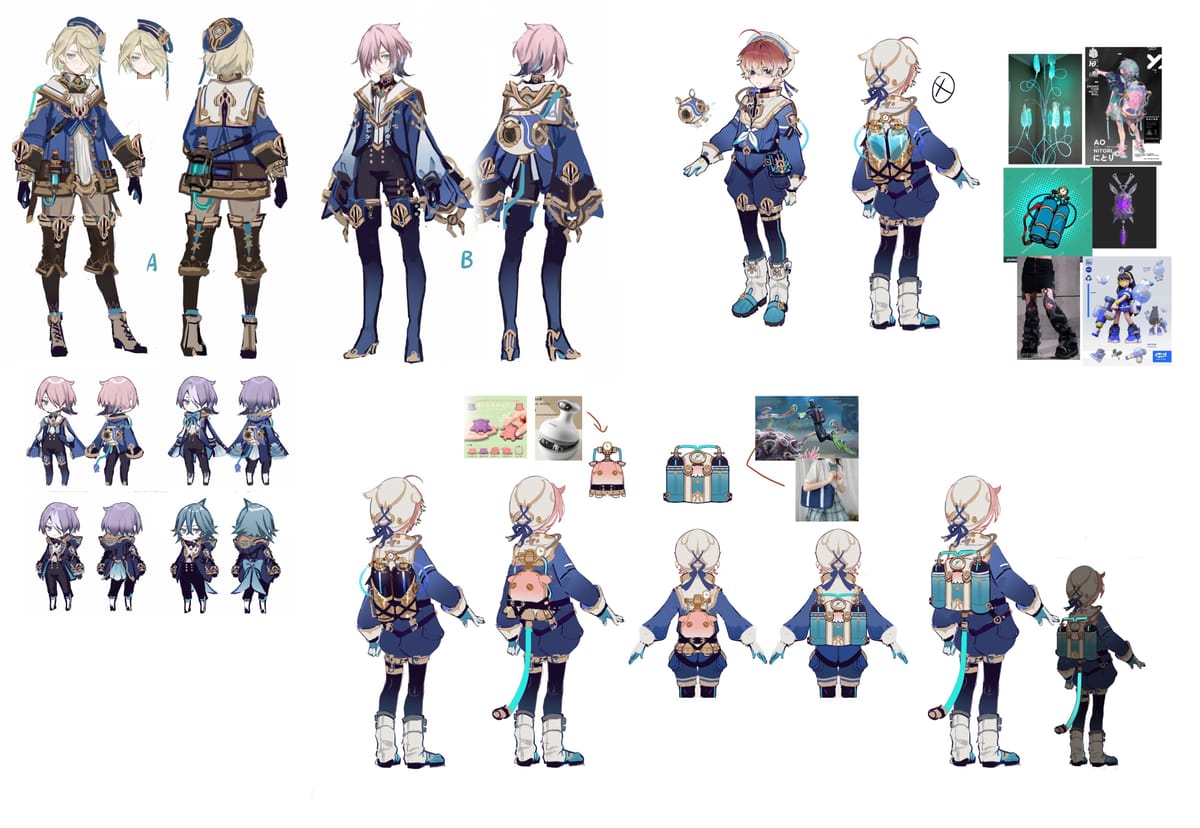 Uno de los aspectos más llamativos de los artes conceptuales de Freminet es el énfasis en la inspiración submarina. Los primeros bocetos exploran diferentes trajes de buceo, estructuras de cascos y elementos mecánicos que se conectan con el tema de tecnología avanzada de Fontaine. El diseño final refina estas ideas en una silueta más limpia, manteniendo un aspecto práctico al tiempo que se alinea con la dirección de arte establecida de Genshin Impact. Este enfoque refuerza la identidad de Fontaine como una región impulsada por la innovación, la maquinaria y la exploración acuática.