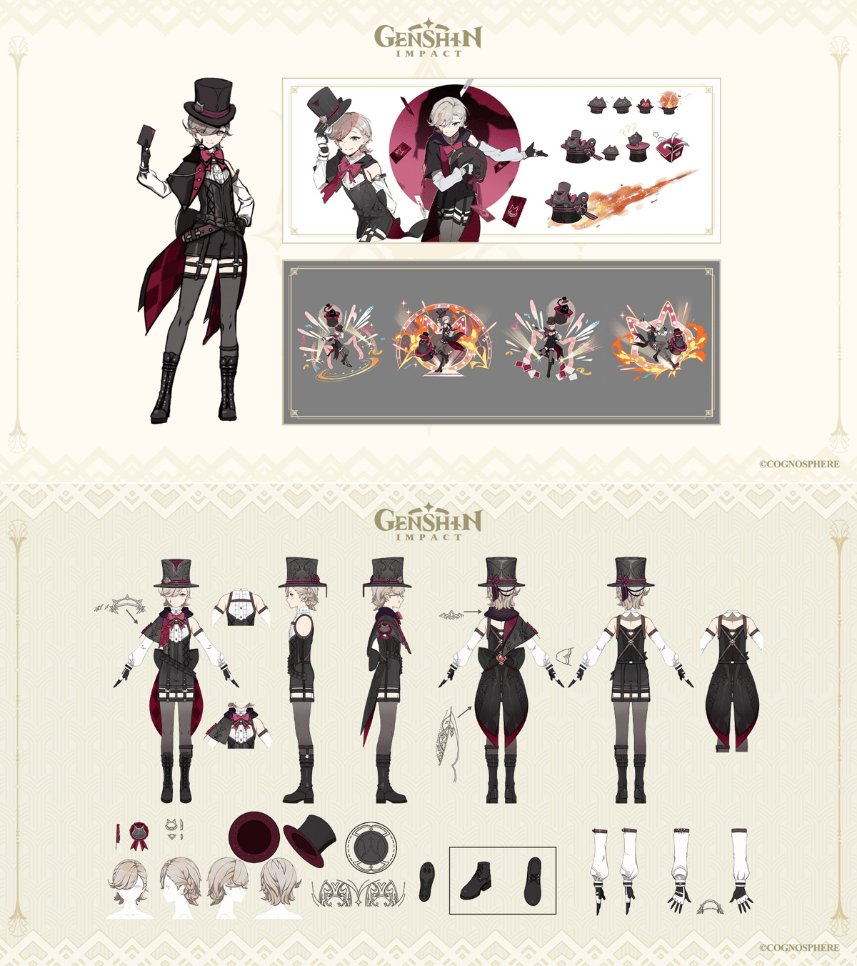 Un enfoque principal de los artes conceptuales es el simbolismo del vestuario. El atuendo de Lyney se inclina hacia el estilo y la espectacularidad, con líneas más nítidas, elementos decorativos y una silueta segura que refleja su papel como el rostro del espectáculo. En contraste, el atuendo de Lynette enfatiza la contención y la sutileza, con formas más limpias y acentos apagados que transmiten compostura y un control silencioso. Juntos, sus diseños crean un diálogo visual deliberado entre expresión y reserva.