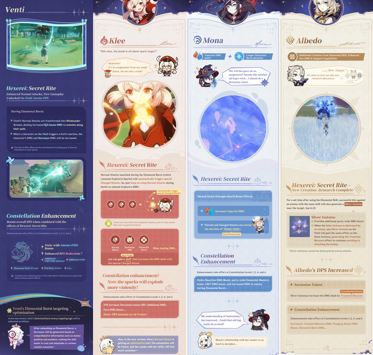 Según el anuncio, “la tarea de las brujas ha comenzado” y cada compañero recibirá un regalo especial para prepararse para un futuro que nadie puede prever. La alineación visual incluye un elenco de personajes de Mondstadt y adyacentes a Mondstadt. Venti, Klee, Albedo, Fischl, Sucrose y otras figuras clave vinculadas a la alquimia, la magia y las historias relacionadas con Hexenzirkel. El mensaje es claro. Estos son los héroes que recibirán nuevas descripciones de talentos, cambios numéricos y posiblemente nuevos efectos pasivos bajo el paraguas de El Regalo de la Bruja.