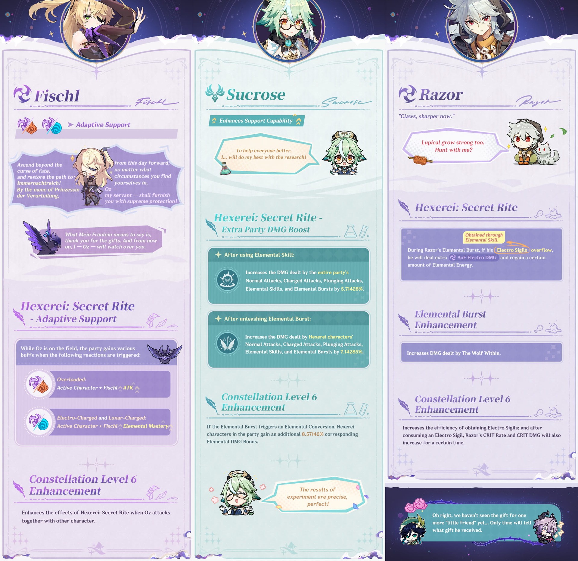 La prominente ubicación de Venti sugiere que el Arconte Anemo podría ser uno de los mayores beneficiarios de El Regalo de la Bruja. El lema debajo de su ilustración dice: “Pongamos en orden estos vientos rebeldes y reunamos un Anemo aún más fuerte. Es hora de tomárselo un poco más en serio.” Esa línea se siente como una promesa directa de que sus talentos o multiplicadores de habilidad recibirán mejoras significativas. Los jugadores ya especulan sobre una mayor consistencia en el control de masas, un daño de ráfaga más fuerte o una nueva sinergia con los próximos soportes Anemo y armas introducidas en Luna III.