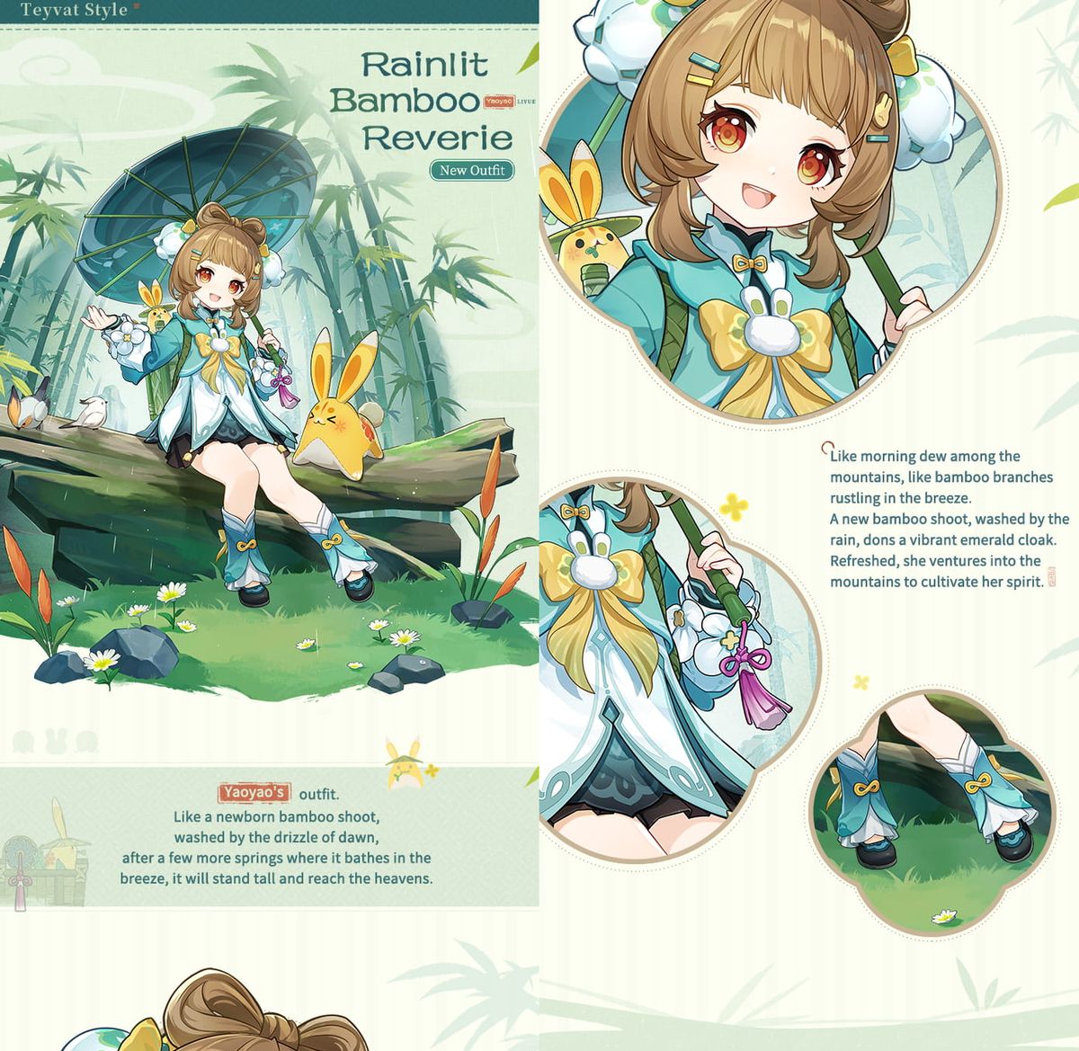 La temática del atuendo se inspira en gran medida en bosques de bambú, la lluvia y suaves paisajes iluminados por la luna, reflejando la conexión de Yaoyao con la naturaleza y su personalidad tranquila y protectora. Telas fluidas, tonos verdes suaves y delicados elementos decorativos crean un estilo visual que se integra a la perfección con la estética tradicional de Liyue, al tiempo que ofrece un refrescante toque estacional. El diseño enfatiza el movimiento y la ligereza, evocando la imagen de la lluvia cayendo entre las hojas de bambú.