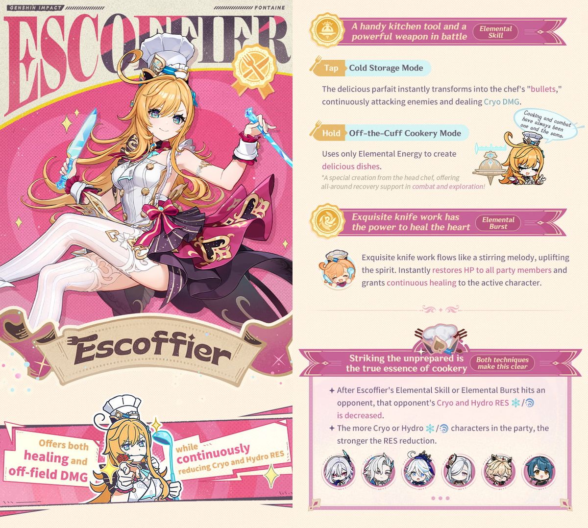 Como personaje de 5 estrellas exclusivo del evento, Escoffier solo estará disponible a través de este banner durante el período del evento. Los jugadores interesados en añadir a la chef Cryo a su equipo deberán participar en el gachapón de tiempo limitado mientras las tasas de obtención aumentadas estén activas.