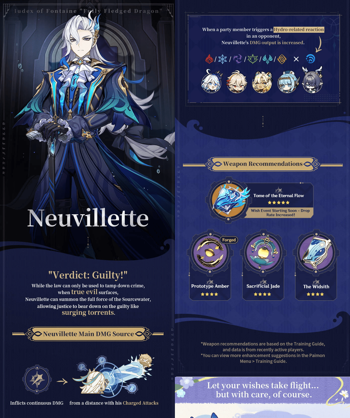 Un punto destacado de Neuvillette: lo último es el regreso de su Gachapón de evento. El Gachapón de evento «Decreto de las profundidades» estará disponible a partir del 3 de febrero a las 18:00 UTC+8, con un aumento significativo en la probabilidad de obtención de Neuvillette, el «Sentenciador de lo Inexorable» (Hydro). Esto brinda a los jugadores la oportunidad de obtener o fortalecer aún más a uno de los personajes Hydro más poderosos de Fontaine, conocido por su imponente presencia y su refinado estilo de combate.