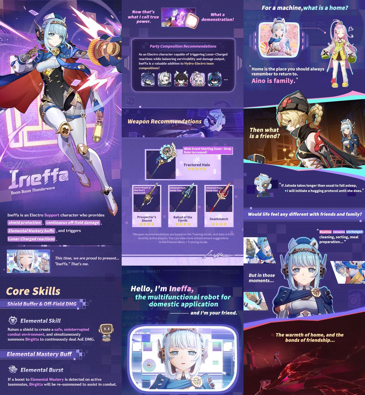 La pieza central de «Actuación Astral» es el personaje de cinco estrellas exclusivo del evento, «Onda de Trueno Explosiva» Ineffa (Electro). Durante este período, Ineffa recibirá un gran aumento en su tasa de obtención, lo que facilitará que los Viajeros la consigan sin depender del gachapón permanente «Pasión por viajar». Como personaje exclusivo del evento, no estará disponible en el gachapón permanente fuera de esta fase, por lo que los jugadores que deseen añadirla a su colección deberían priorizar sus deseos durante «Actuación Astral».