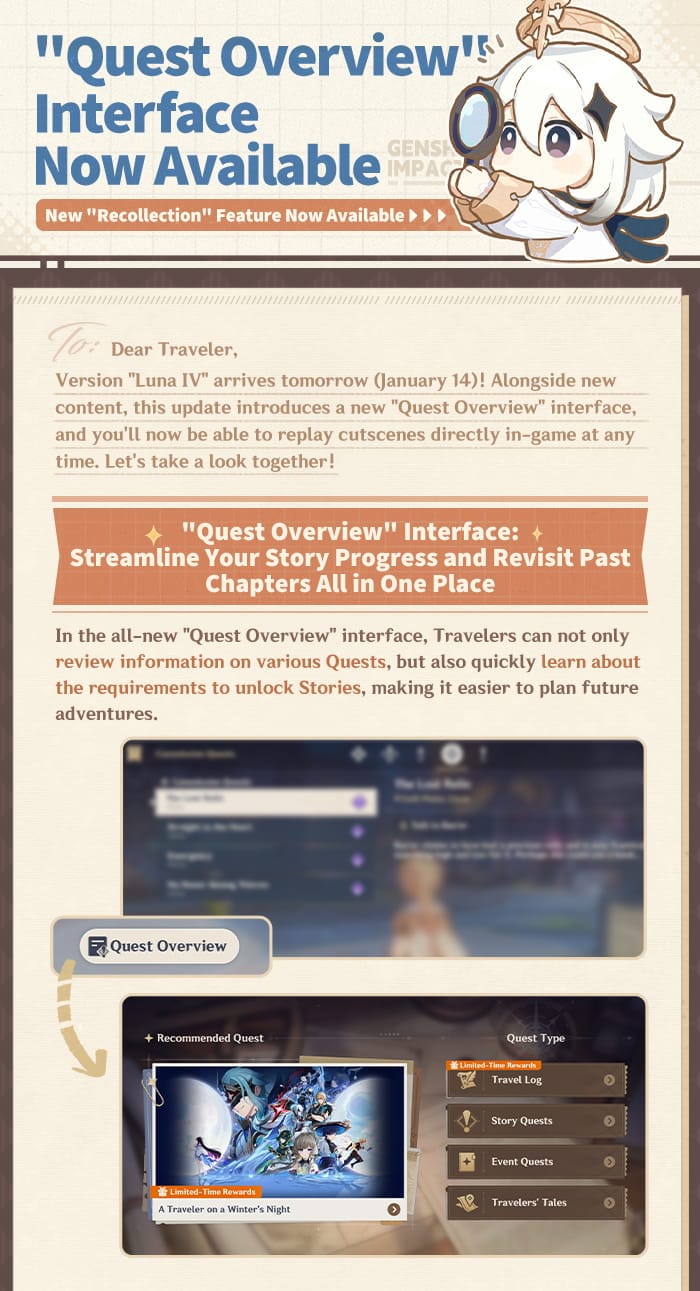 Con la llegada de la versión “Luna IV” de Genshin Impact el 14 de enero, HoYoverse presenta una muy esperada mejora de calidad de vida centrada en la narrativa y la gestión de misiones. Junto con nuevo contenido y eventos, la actualización lanza oficialmente una nueva interfaz de Resumen de misiones y la tan solicitada función de Recuerdos, que permite a los jugadores volver a ver las cinemáticas del juego en cualquier momento. Estas adiciones buscan mejorar la accesibilidad narrativa, la inmersión a largo plazo y la experiencia general del usuario tanto para los Viajeros nuevos como para los veteranos.