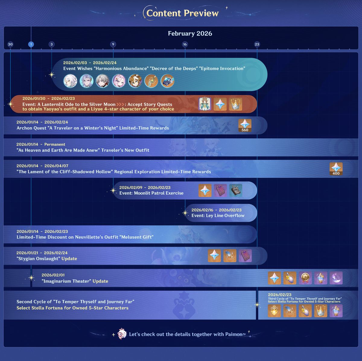 Los jugadores orientados al combate pueden esperar la actualización “Acometida Estigia”, activa del 21 de enero al 24 de febrero, mientras que el contenido de final de juego se expande con la actualización del Teatro Imaginarium que llegará el 1 de febrero. Además, el segundo ciclo de “Templarse en el Viaje Lejano” permite a los jugadores seleccionar una Stella Fortuna para personajes de 5 estrellas que posean, y el tercer ciclo comenzará el 23 de febrero.