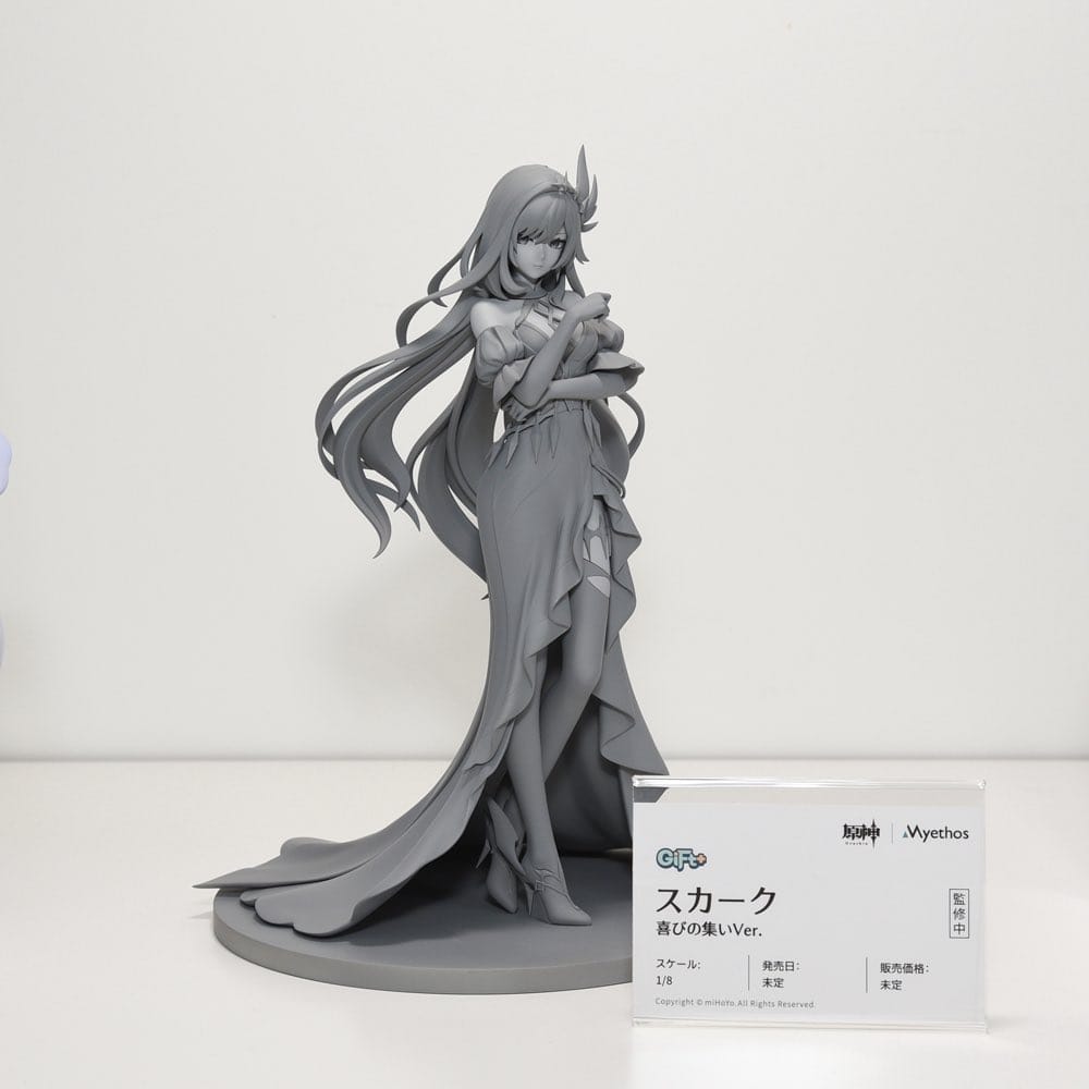 El prototipo exhibido se presenta en gris, una etapa estándar en la revelación de figuras que enfatiza la calidad del esculpido, las proporciones y los detalles finos antes de aplicar el color final. Incluso en esta fase, el diseño de Skirk destaca por su pose dinámica, los elementos fluidos de su atuendo y una fuerte sensación de movimiento que refleja el tema de Carnival Gathering. La figura equilibra elegancia e intensidad, capturando la misteriosa presencia de Skirk en una forma que se siente tanto teatral como refinada.