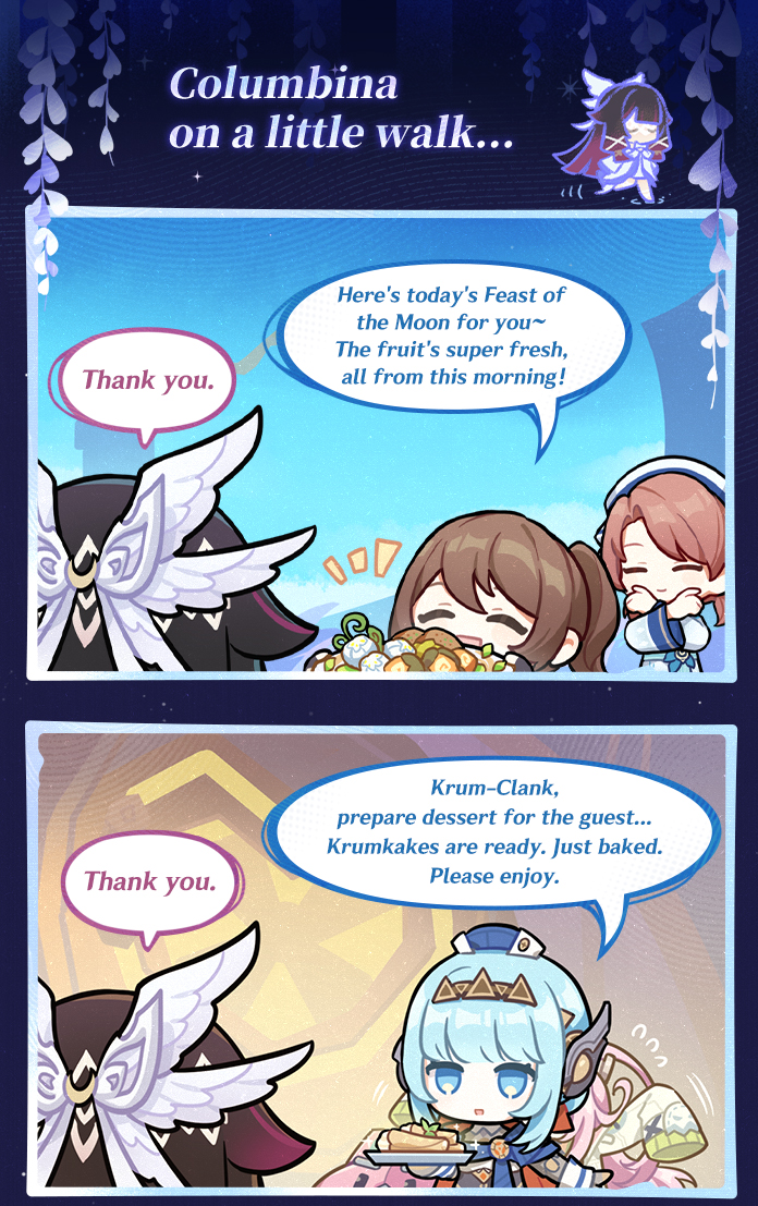 The comic opens with Columbina calmly walking through town, immediately establishing her gentle and reserved demeanor. She is approached by locals offering food and desserts in celebration of the Feast of the Moon. Fresh fruit prepared earlier that morning and newly baked Krumkakes are presented to her with warmth and enthusiasm. In each case, Columbina responds with a simple but polite “Thank you”, reinforcing her quiet nature and graceful manners.