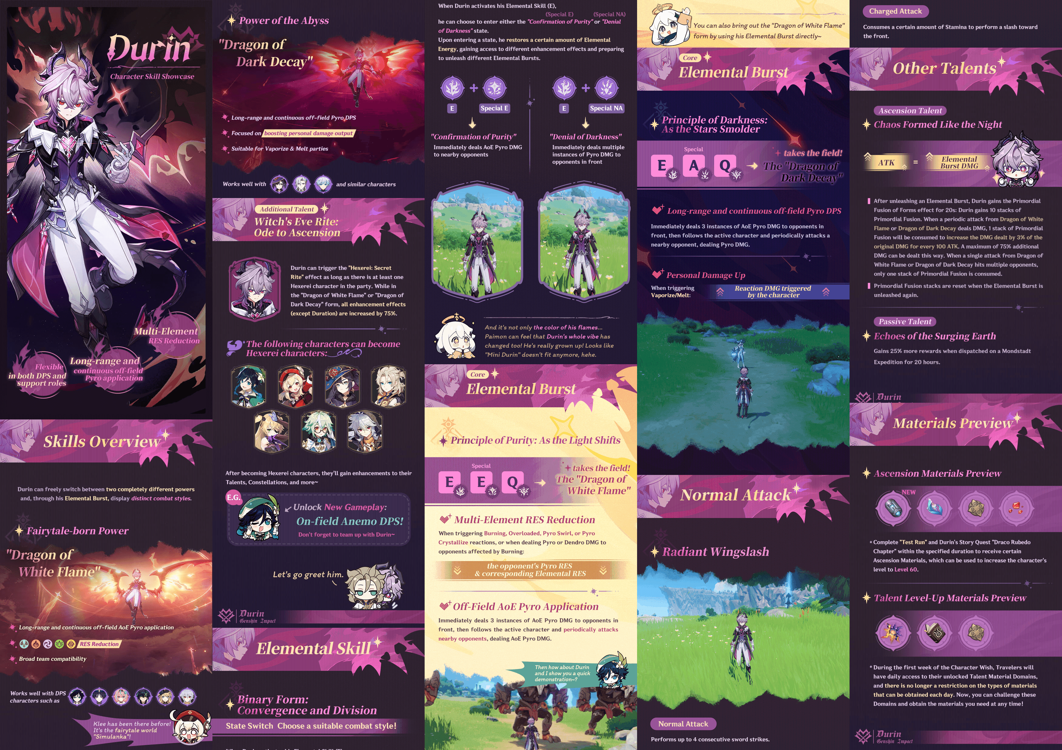 Overall, the Durin Character Skill Showcase paints a picture of a highly adaptable Pyro dragon who can cover multiple roles with a single slot. White Flame mode emphasizes team buffs, RES reduction and wide AoE Pyro, while Dark Decay highlights personal DPS and classic reaction power. For Travelers planning future pulls, Durin looks ready to become a centerpiece for both Simulanka themed teams and long term Pyro focused lineups in Genshin Impact.