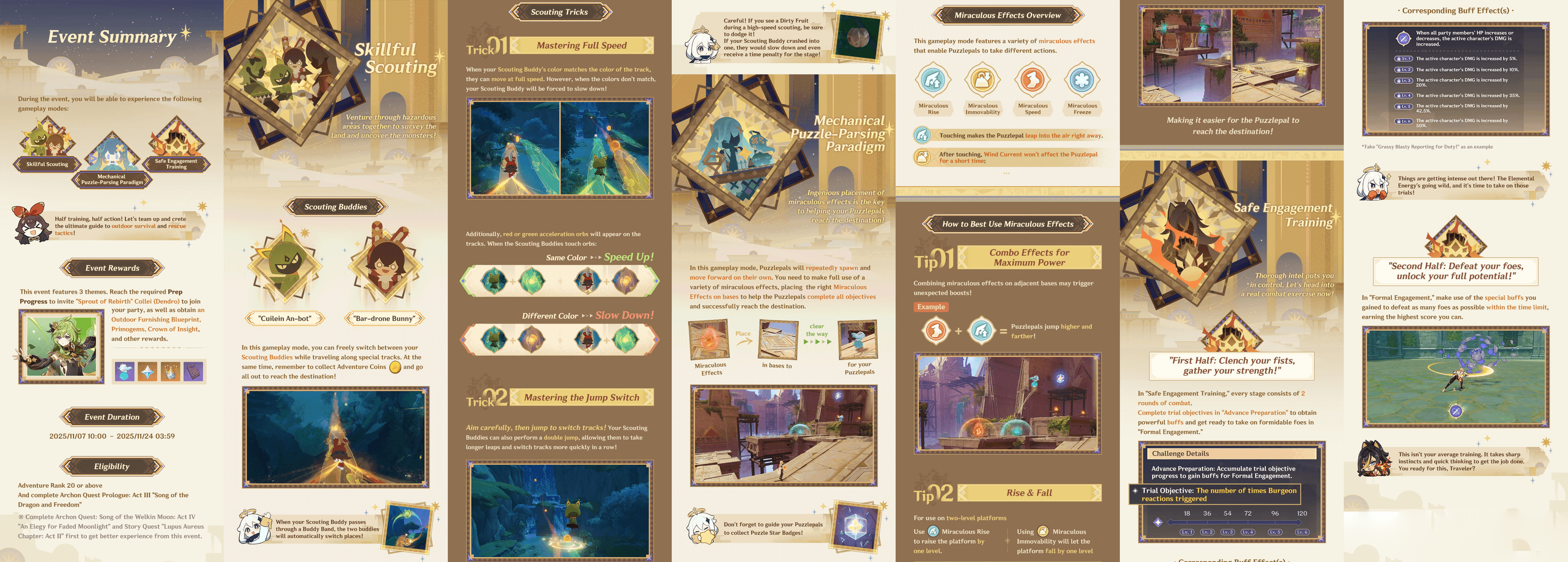 According to the event description, the story begins when a series of unusual elemental disturbances are detected in the depths of the Sumeru desert. Players will join researchers from the Akademiya’s Fieldwise Center, investigating ancient mechanisms that have suddenly reactivated. These ruins are filled with traps, rotating structures, and environmental hazards reminiscent of early Sumeru exploration events. The emphasis will be on scouting enemies, solving mechanical puzzles, and adapting strategies to each stage’s elemental challenges.