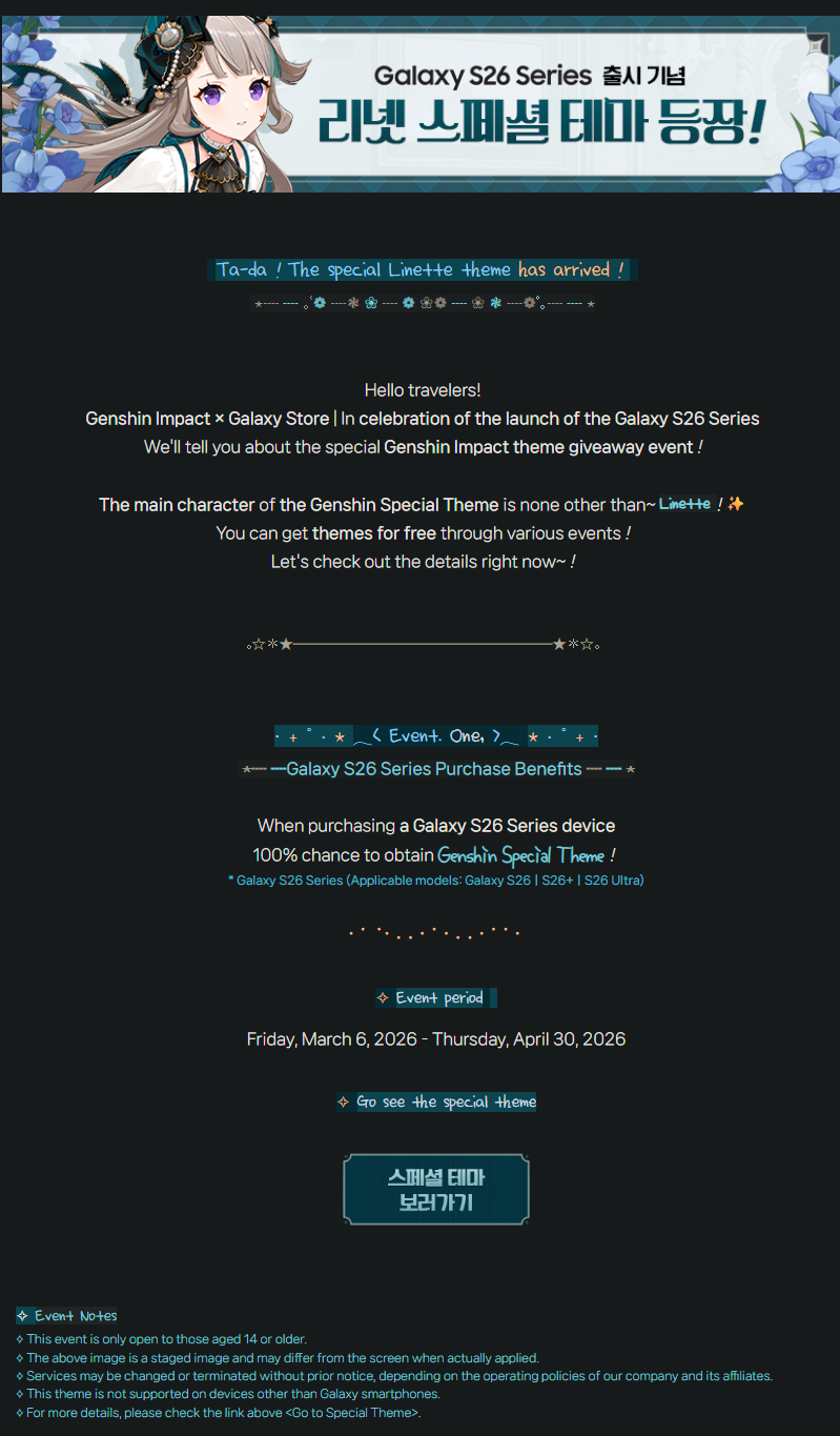 Following the broadcast, details emerged about a Galaxy Store exclusive Genshin Special Theme designed specifically for Galaxy S26 users. The themed package is expected to include custom wallpapers, lock screen visuals, icon designs, and potentially system UI elements inspired by Genshin Impact’s signature art style. Such smartphone themes are increasingly popular among fans who want to extend their gaming identity into daily device customization.