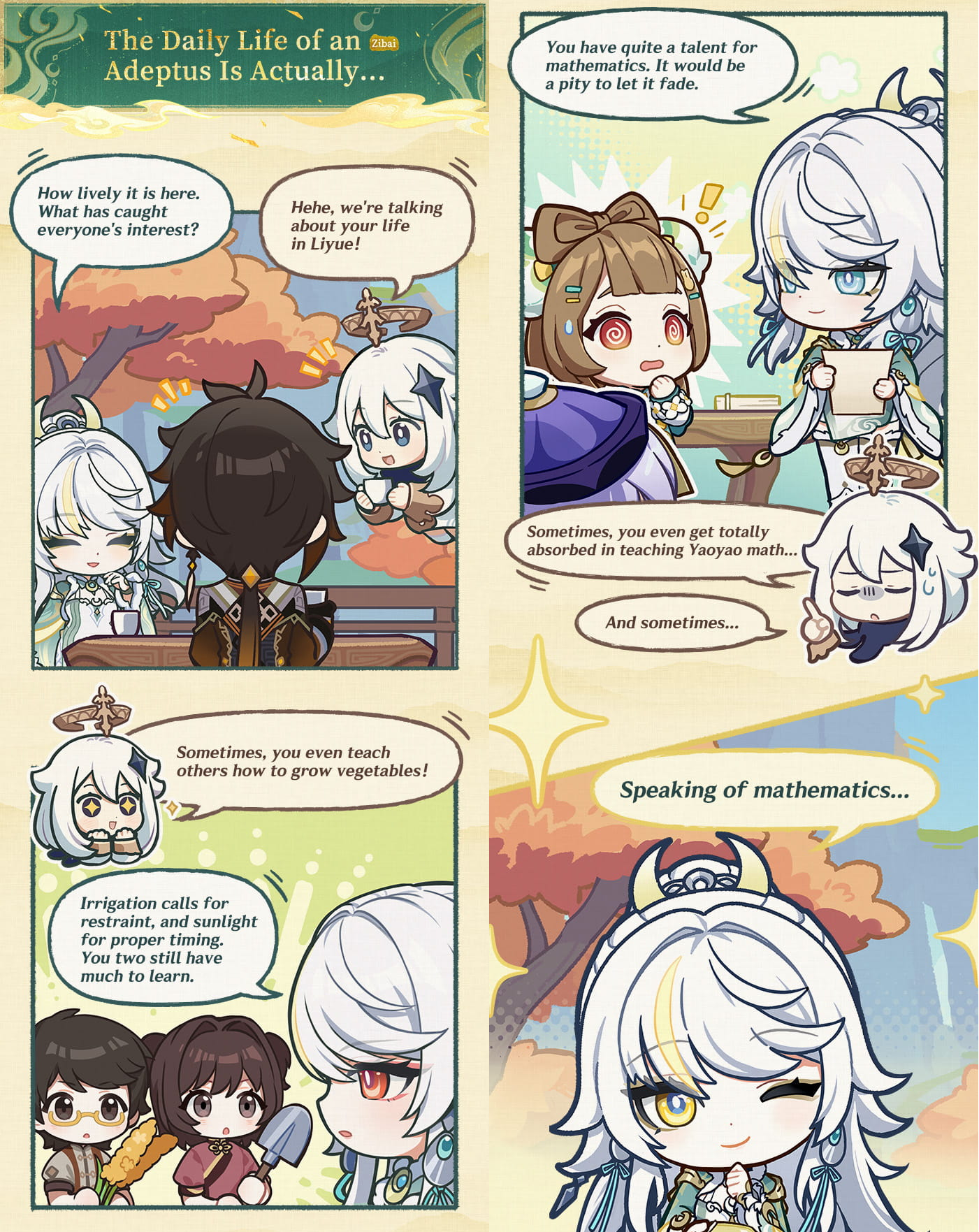 The comic strip format allows the storytelling to shine through expressive art and lighthearted pacing. Visual humor, gentle expressions, and carefully framed scenes highlight Zibai’s personality, balancing her Adeptus identity with a sense of curiosity and adjustment. These moments reinforce the idea that even powerful beings in Teyvat experience change, routine, and reflection.