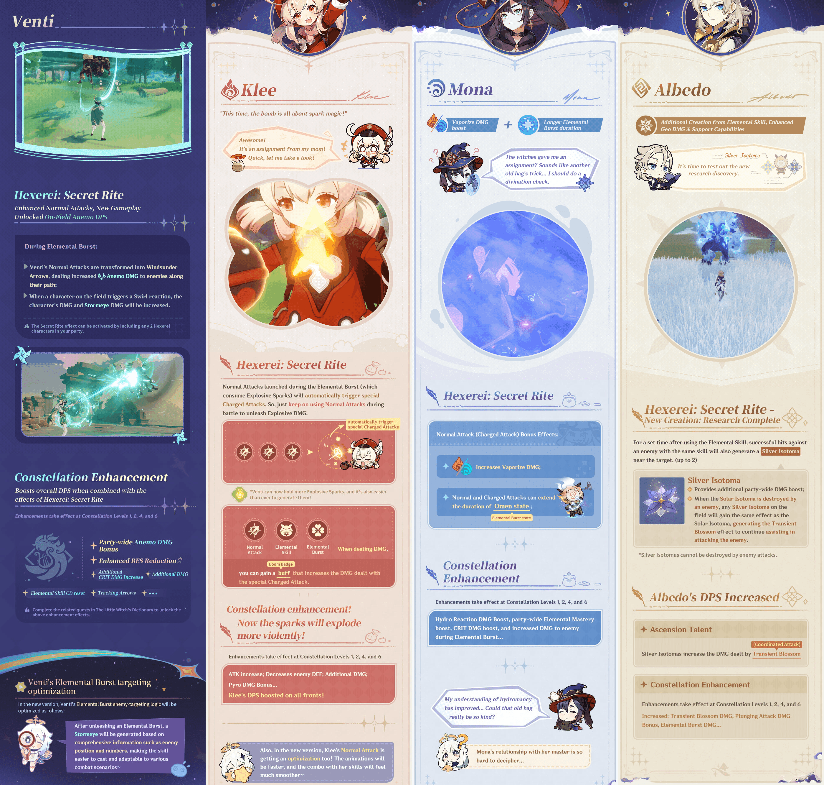 According to the announcement, “the witches’ homework has begun” and each companion will receive a special gift to prepare for a future that no one can foresee. The visual lineup includes a roster of Mondstadt and Mondstadt adjacent characters. Venti, Klee, Albedo, Fischl, Sucrose, and other key figures tied to alchemy, magic and Hexenzirkel related stories. The message is clear. These are the heroes who will receive new talent descriptions, numerical changes and possibly fresh passive effects under the umbrella of The Witch’s Gift.