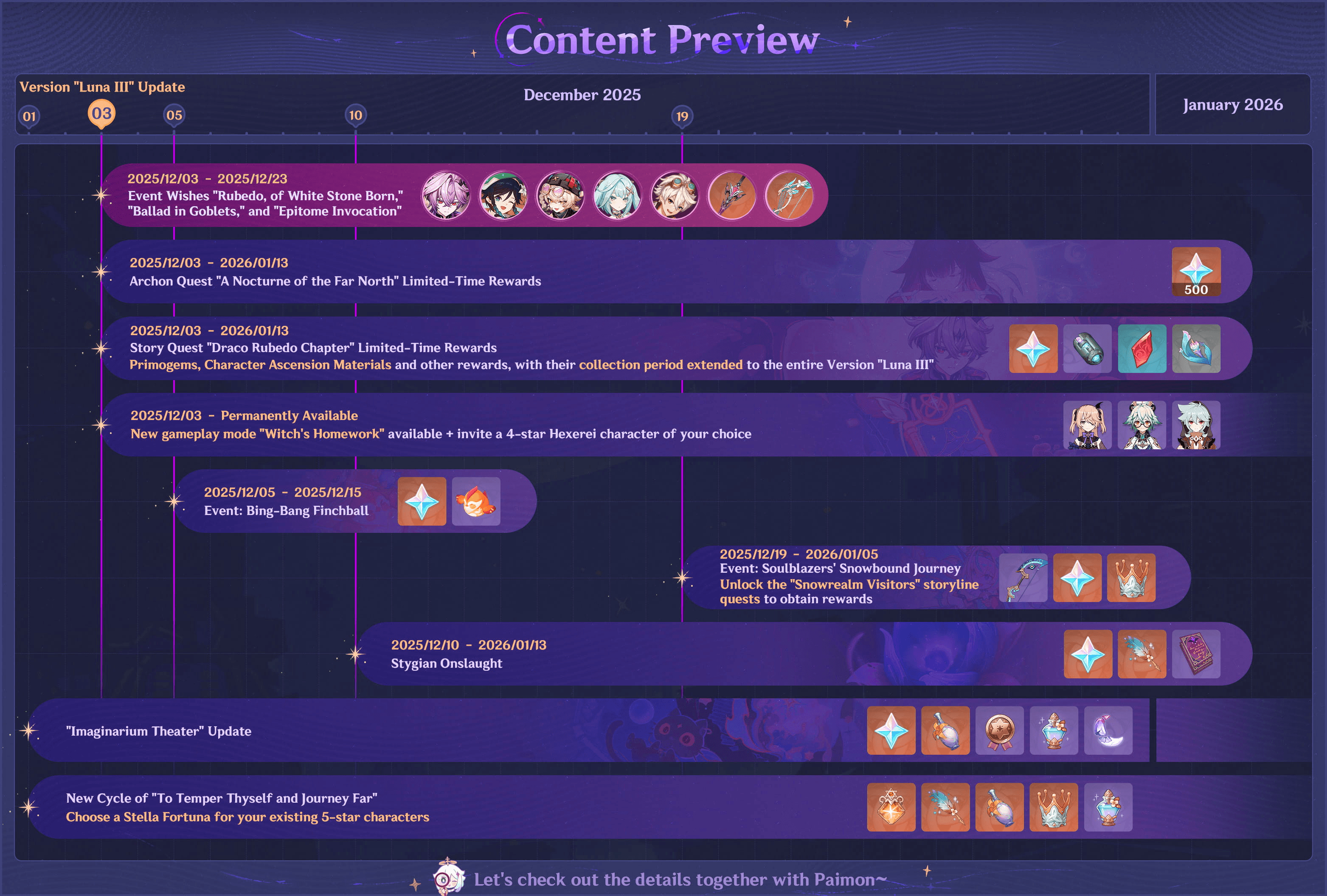 Under the Version “Luna III” notices, Travelers will find additional specifics about individual events. These notices usually break down event durations, gameplay modes, reward structures and eligibility requirements. The Phase I preview recommends checking these pages to stay organized, particularly if you wish to optimize Primogem income or complete patch limited objectives before they expire. The inclusion of long running systems like “To Temper Thyself and Journey Far” means that new goals may unlock gradually throughout the patch, encouraging players to keep an eye on the event menu.