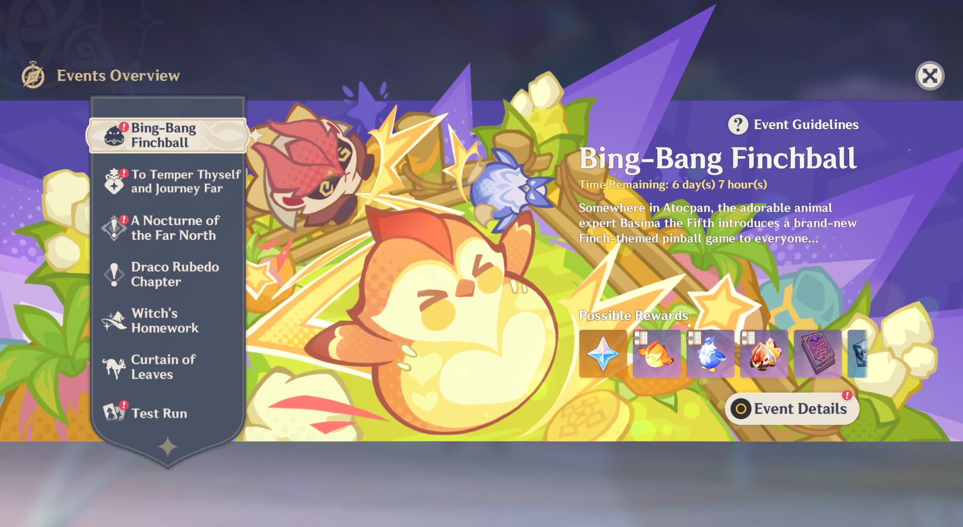 The Natlan themed event currently active in Version 6.2 features Bing Bang Finchball, a colorful mini game set in Atocpan and introduced by Basima the Fifth, an animal expert beloved for her whimsical tone. The event presents a finch themed pinball style experience, leaning heavily into charm, bright visuals and accessible gameplay. Many players welcomed this change of pace, praising the event for its relaxing mechanics, adorable art direction and quick daily rewards. Rewards such as Primogems, event exclusive items and upgrade materials were highlighted as a strong incentive for casual participation.