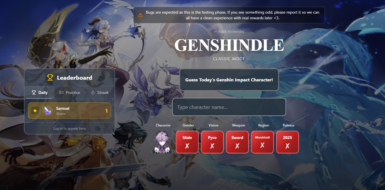 Test your Genshin Impact knowledge with Genshindle! Guess the mystery character each day based on clues like element, weapon, region, and release date. Build your streak by playing daily, compete on the leaderboard, and prove you're the ultimate Genshin expert. Currently featuring Classic mode - more modes coming soon! Note: We're still working on 'The Wheel', stay tuned!